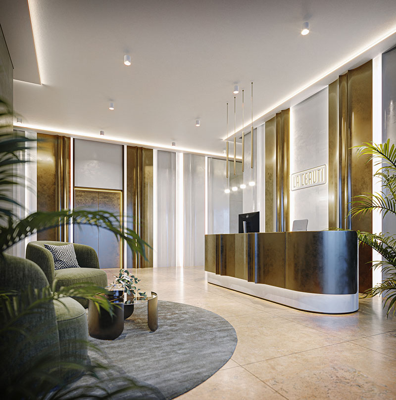 La hall d’ingresso di La Ceruti è il primo gesto di benvenuto: luminosa, elegante, rivestita di metalli caldi e superfici chiare che riflettono la luce con discrezione.