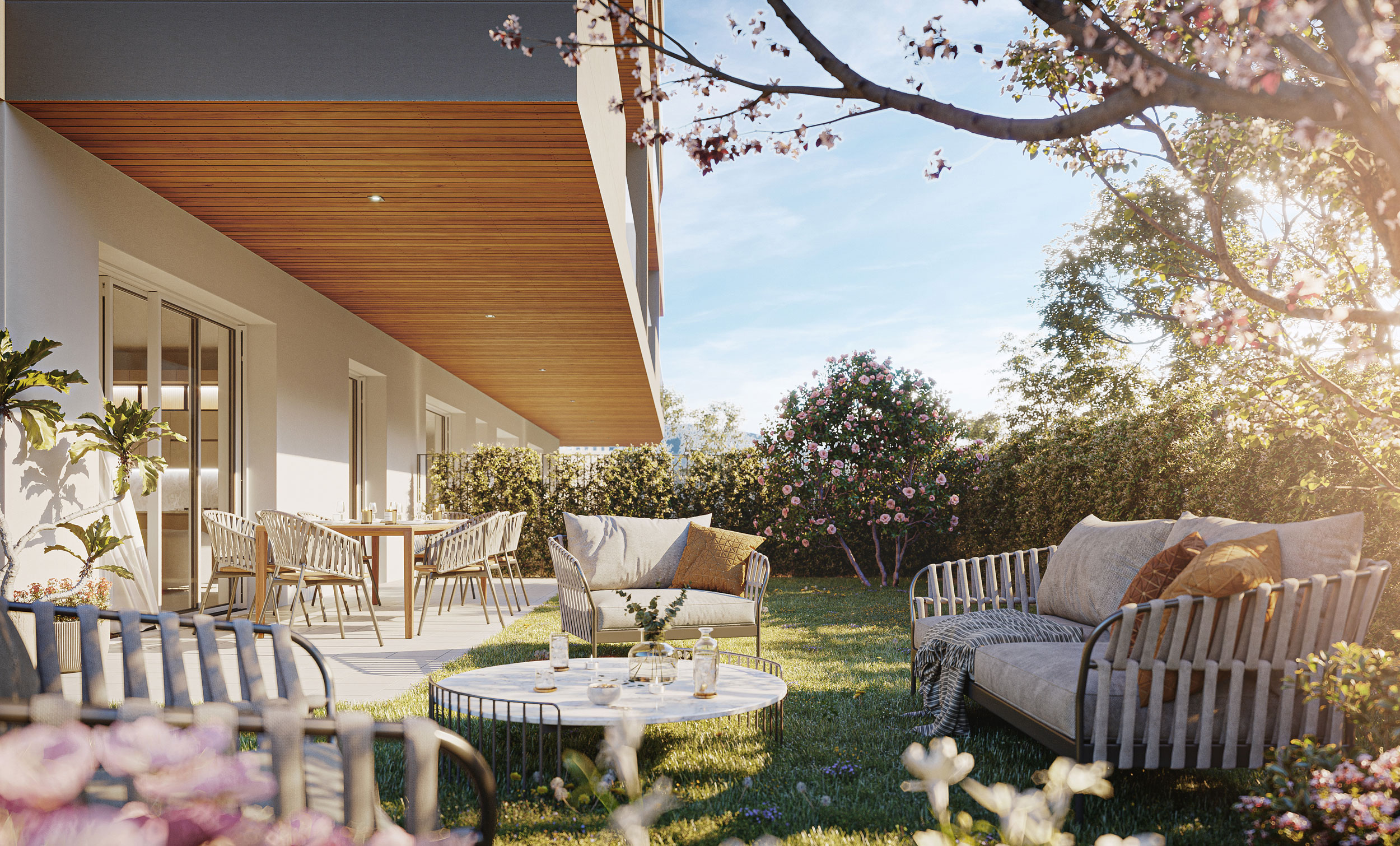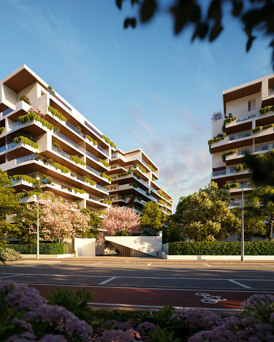 La presenza di ampie aree verdi condominiali che avvolgono i fabbricati creano un dialogo costante tra spazio privato e paesaggio, offrendo privacy, benessere e una migliore qualità dell’abitare.